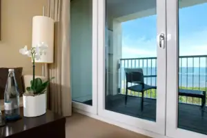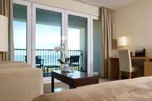 Kleiner Raum, der große Ruhe schenkt – mit direktem Blick auf das Sylter Wattenmeer. Verbindungstür zur Suite Deluxe Meerblick möglich.