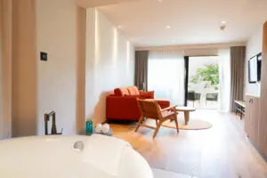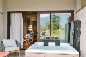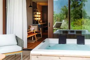 Privater Whirlpool im Garten, frei stehende Badewanne im Wohnbereich. Diese Suite ist Ihr ganz persönlicher Wohlfühlkosmos – umgeben von Natur.