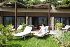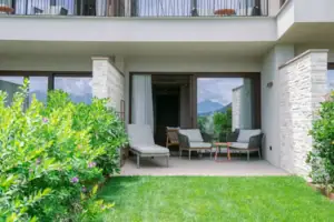 Ruhe im eigenen Garten mit Blick auf den Gardasee. Jedes Zimmer verfügt über eine private Terrasse mit Garten, wo Sie sich ganz und gar dem süßen Nichtstun hingeben können.