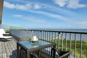 Stilvolles Wohnen vereint mit einem herrlichen Blick auf das Meer: Von Ihrer privaten Loggia aus können Sie die Wellen beobachten und den Duft der Nordsee tief einatmen.