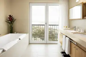 Kleiner Raum, der große Ruhe schenkt – mit direktem Blick auf das Sylter Wattenmeer. Verbindungstür zur Suite Deluxe Meerblick möglich.